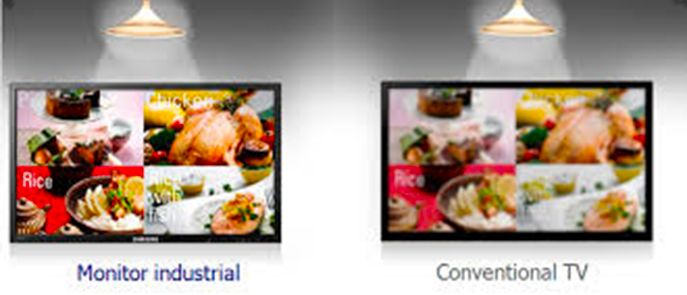 - Contraste: mientras las pantallas o monitores industriales tienen modelos para instalaciones en exteriores o semiexteriores con brillo hasta 4 veces superior al de un televisor ya que éste presenta sólo 400 nits en promedio.